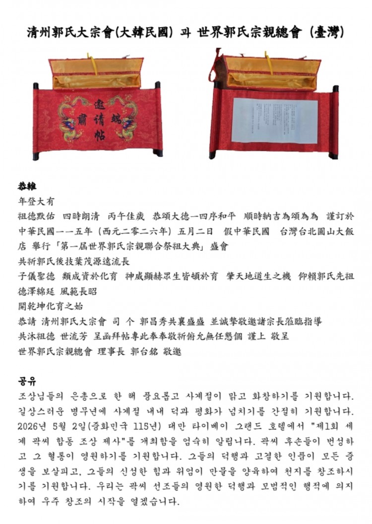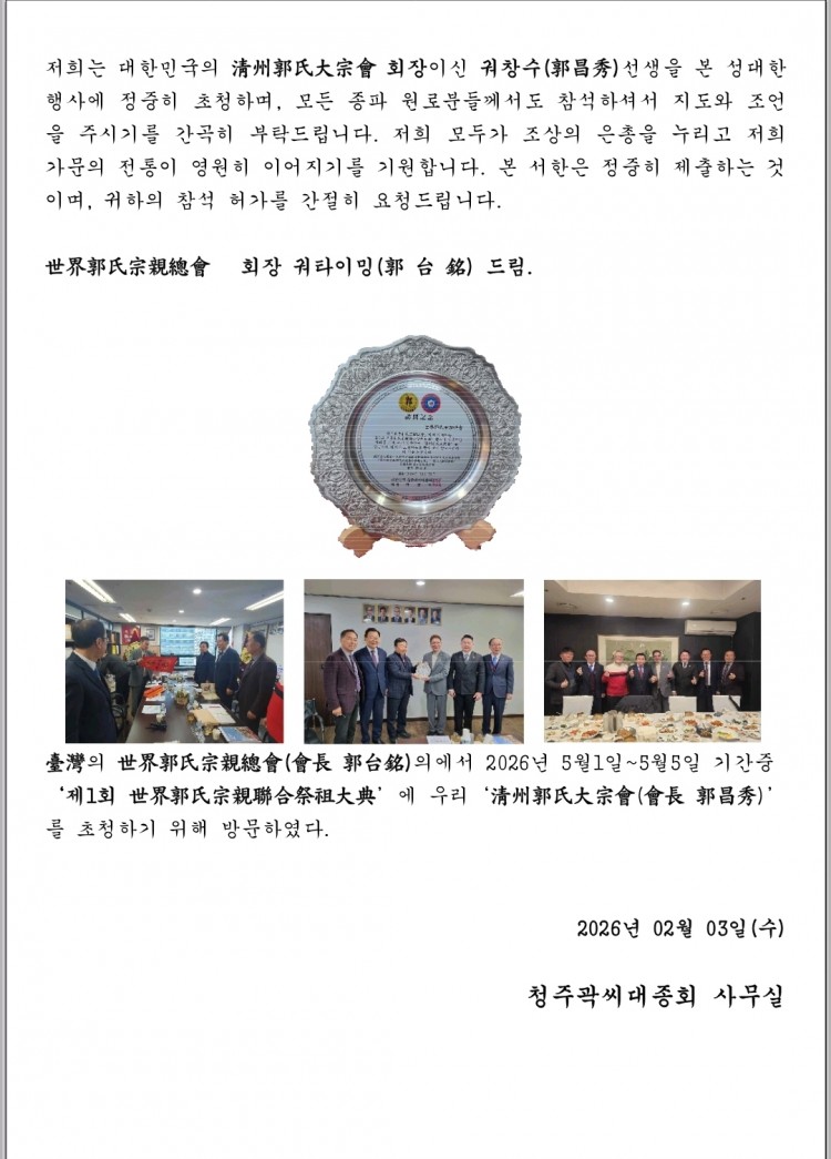 청주곽씨 대종회의 국제화 관계 추진. 페이지 정보 홍보부회장 작성일26-02-07 12:08 조회57회 댓글0건 이전글 다음글 목록 본문 댓글목록 등록된 댓글이 없습니다. 이전글 다음글 목록