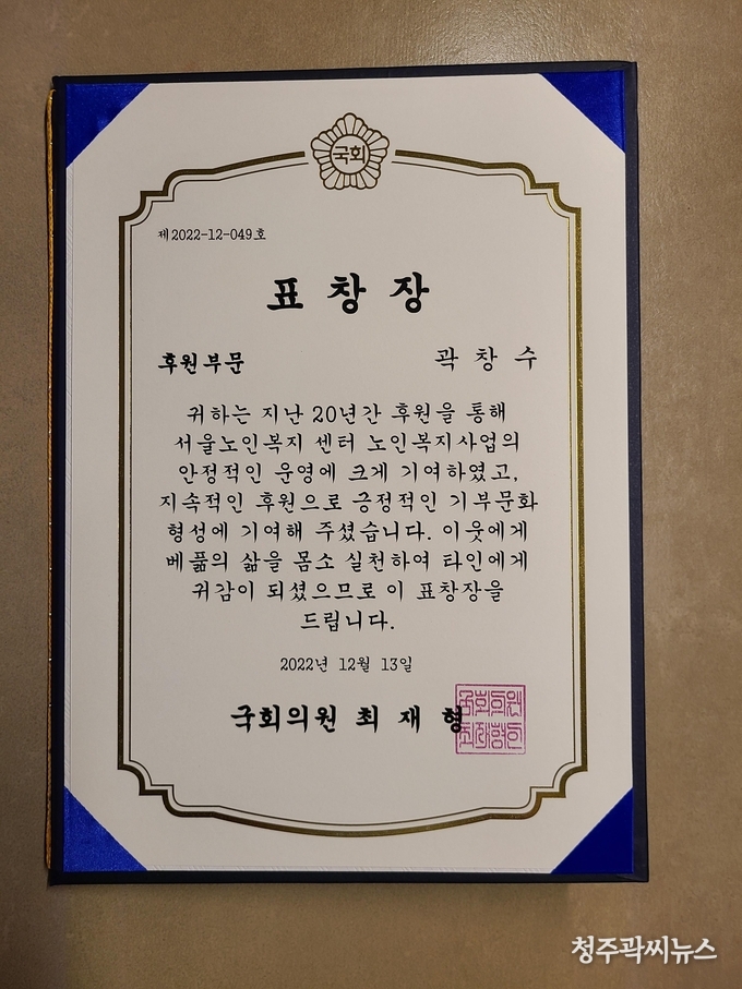청주곽씨대종회 곽창수 회장은 12월 13일 서울노인복지센타에서 후원부문 최재형 국회의원 표창을 수상했다.